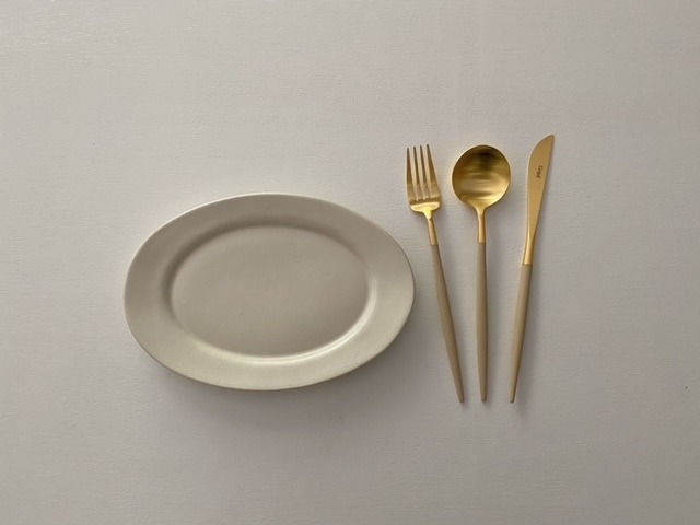 クチポール ゴア アイボリー×ゴールド 〇デザートフォーク サイズ(目安)/18.5㎝ 材質/18-10ステンレスと24K ゴールド、樹脂 重さ/16g 生産国/ポルトガル 食洗器△手洗いをおおすすめします。 〇デザートスプーン サイズ(目安)/23cm 重さ/23g 材質/18-10ステンレスと24K ゴールド、樹脂 生産国/ポルトガル 食洗器△手洗いをおおすすめします。 デザインから仕上げまで自社の職人の手で作り上げています。 GOAシリーズは、繊細なフォルム、樹脂とステンレスのバランスが美しく、21世紀のカトラリー界のスタンダードを築いたと言われています。 優しいイメージとモダンさを兼ね備えたアイボリー×マットゴールド