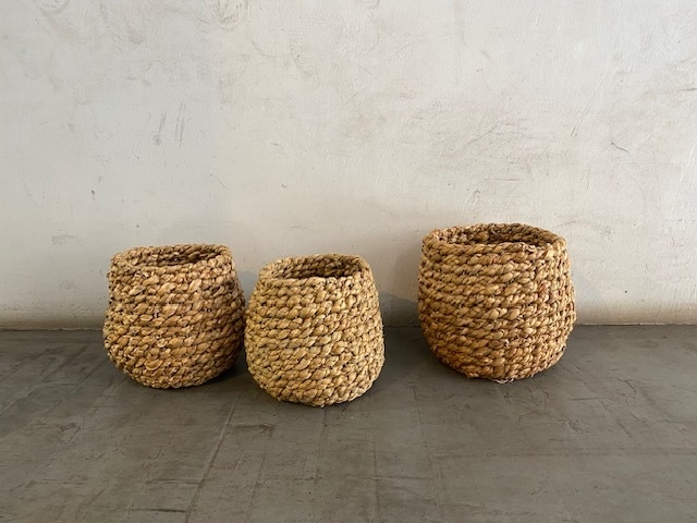 Size : S= 約 25 x 25 x h23cm Material : Water hyacinth Made in : Vietnam Water hyacinth(ホテイアオイ,水草の一種)の茎を乾燥させたものを三つ編みにし、しっかりと編まれた、やや下膨れ型のバスケット。 ベトナムの職人の手によって作られています。 とても太く 丈夫で柔らかな繊維なので、編み上がったものからは、力強い素材感が感じられます。 鉢カバー、くずかご、物入れなどに。 ◎全て天然の材料を使い、ベトナムの職人の手作業によって作られています。 網目の大きさ、サイズ・形などには編み手の違いによる個体差やゆがみがございます。 あらかじめご了承ください。 ◎汚れた場合は固く絞ったタオルで拭いて下さい。 ◎カビの原因になりますので、湿度の高い場所でのご使用はご遠慮ください。濡れた場合は、よく乾かしてください。