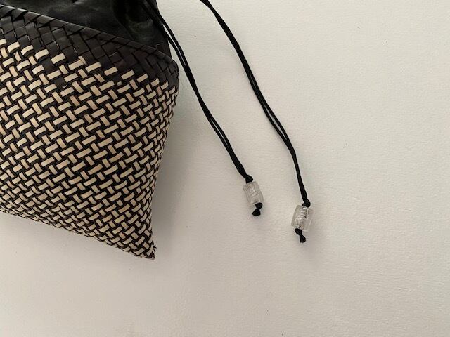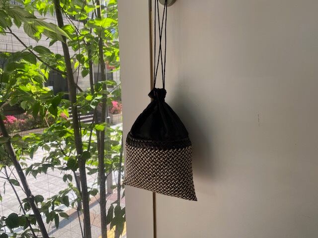こちらは、シルク100%のファブリックや、ハンドメイドのグラスビーズと組み合わせた巾着。